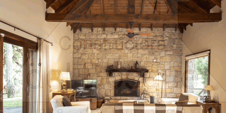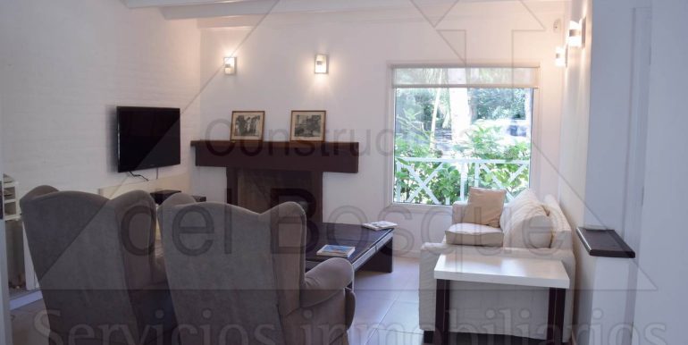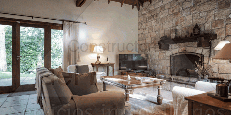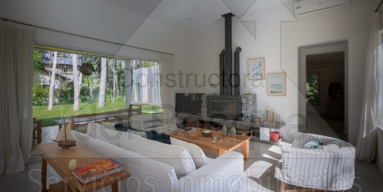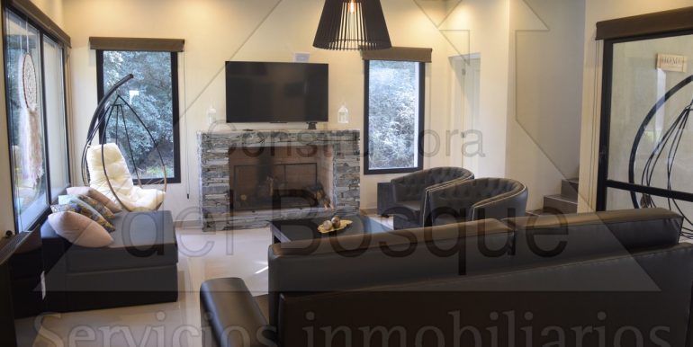 Living con grandes ventanales y vistas hermosas al bosque, cuenta con hogar…