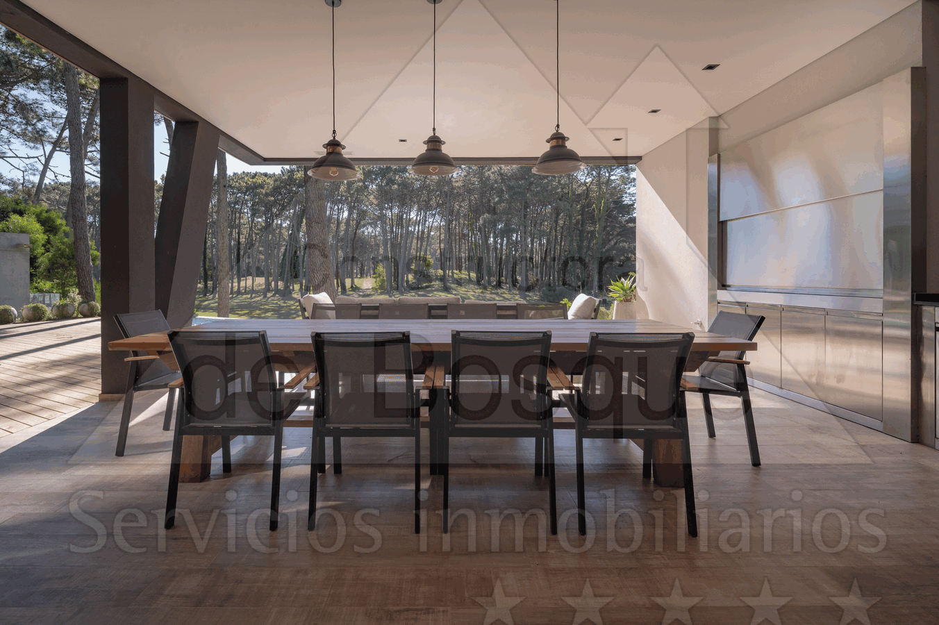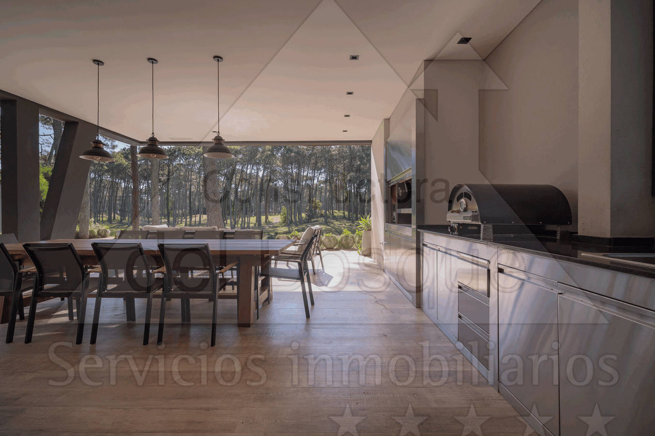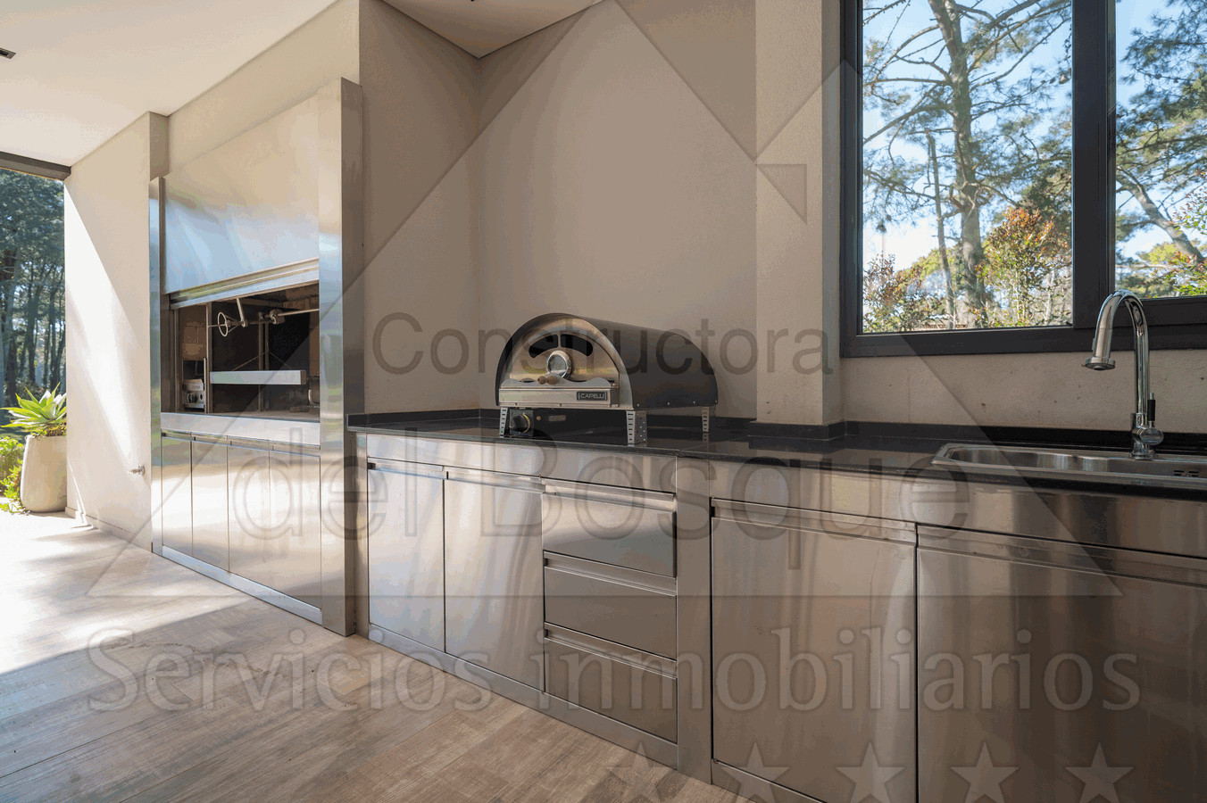 Cubierta , con galería al golf. Tiene parrilla a carbón, parrilla pequeña a gas y horno pizzero