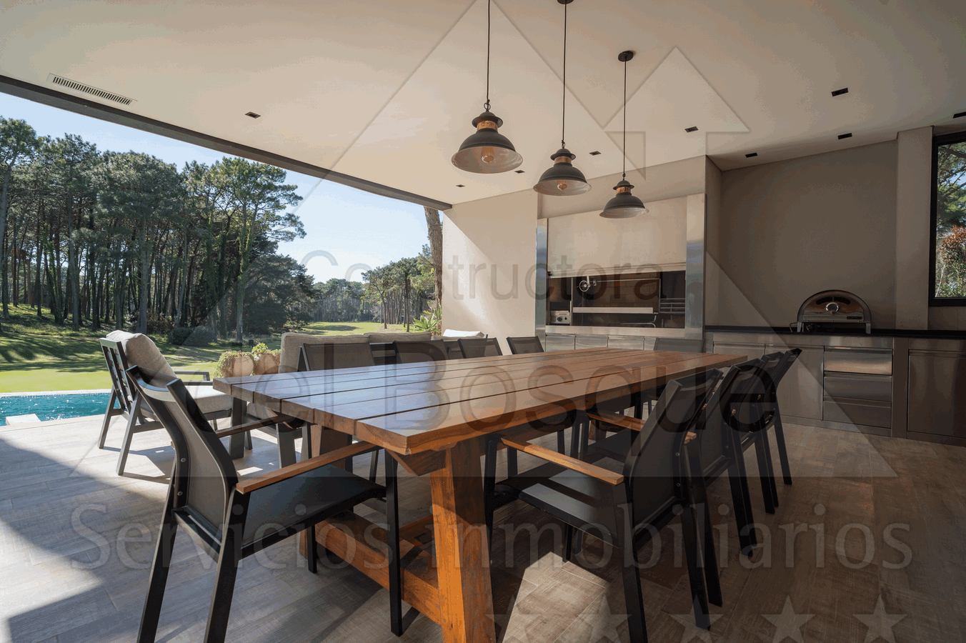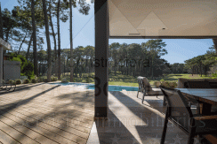 Piscina climatizada con borde infinito al golf. Parrilla cubierta con parrilla a carbon y una pequeña a gas, horno pizzero.