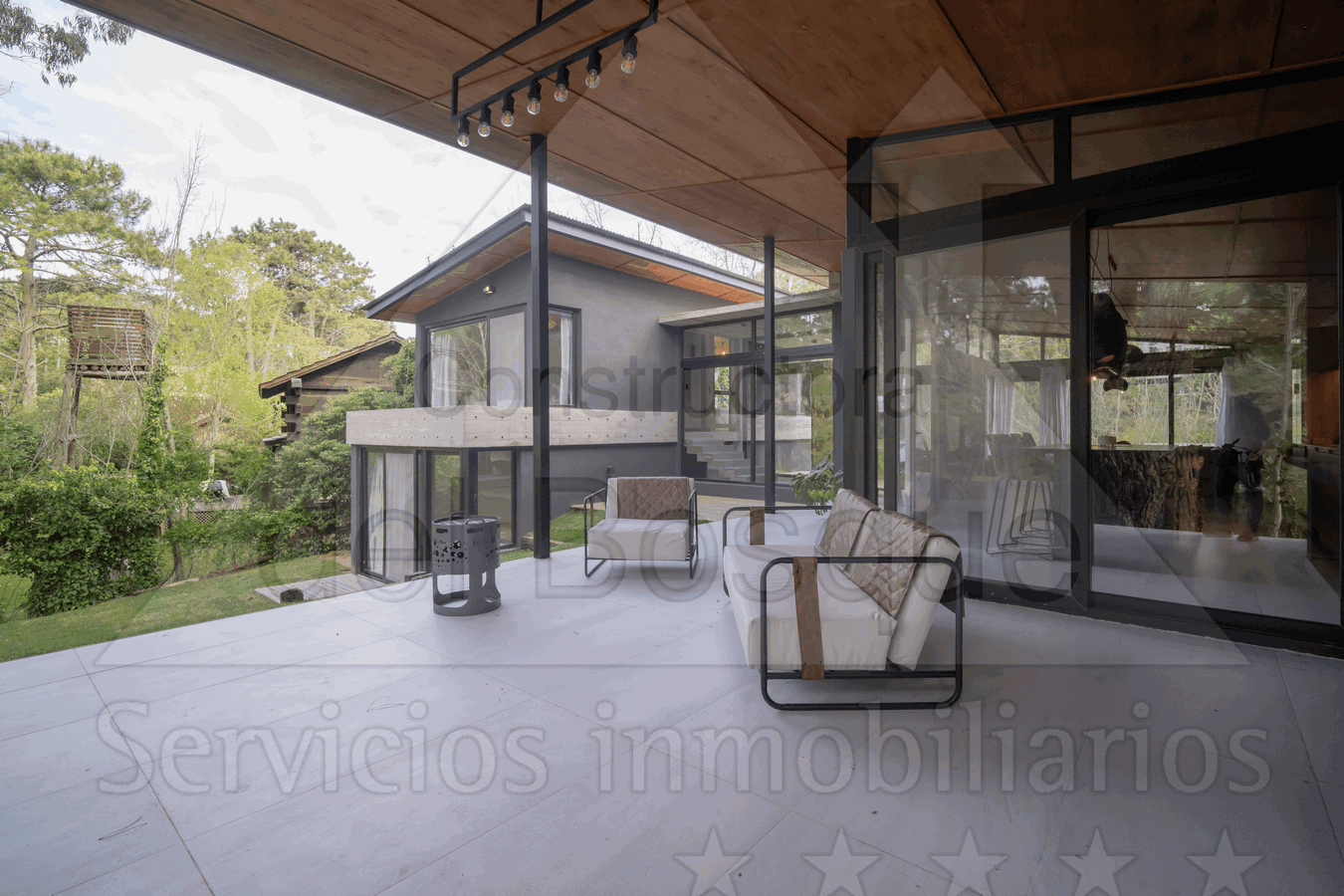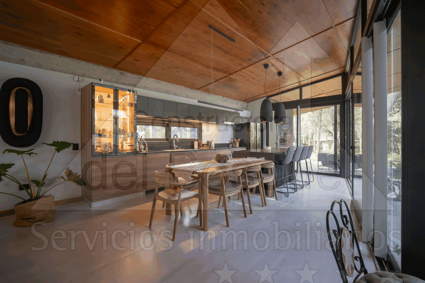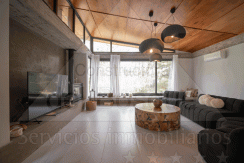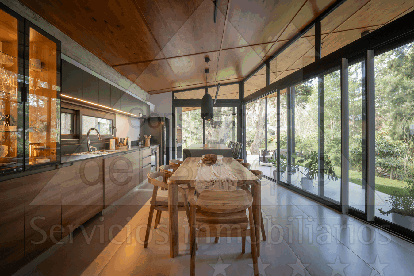 Acceso por escaleras donde encontramos un hermoso espacio de living totalmente vidriado, comedor integrado y la cocina totalmente equipada con una amplia barra desayunadora y conexión al sector exterior donde encontramos el living exterior con su mobiliario y la parrilla techada con vista al jardín .