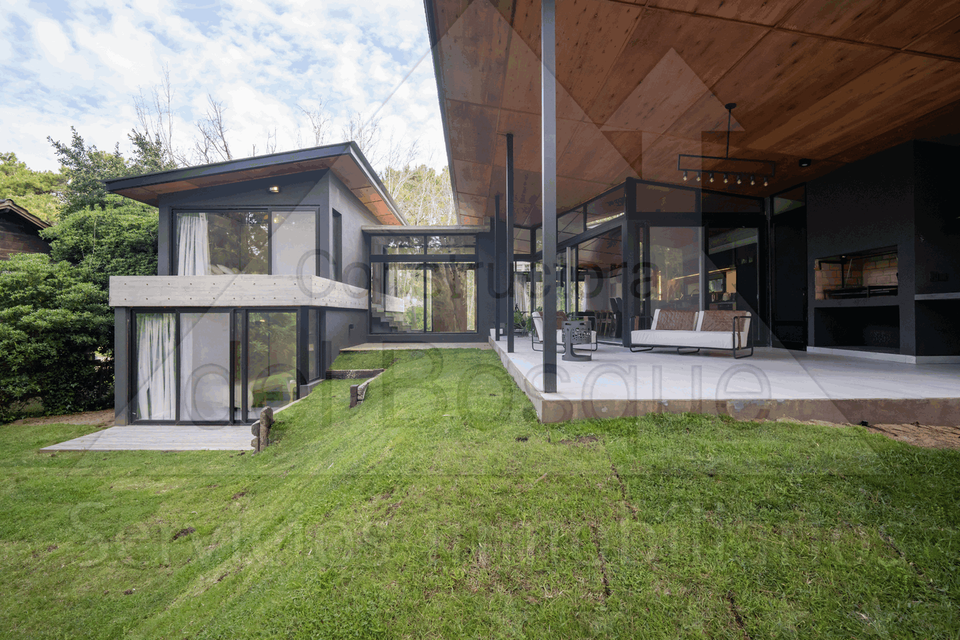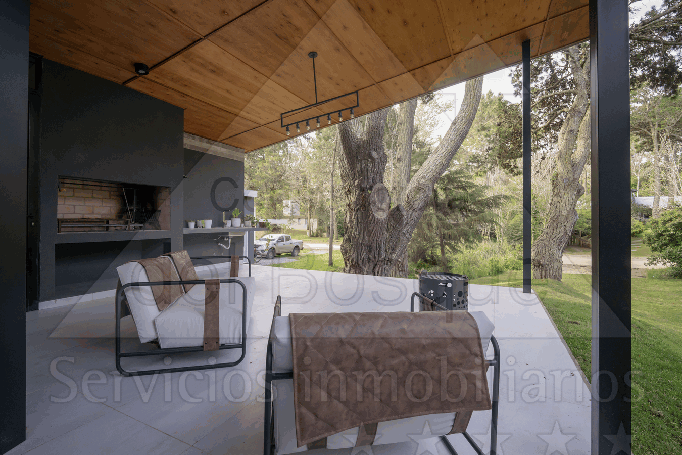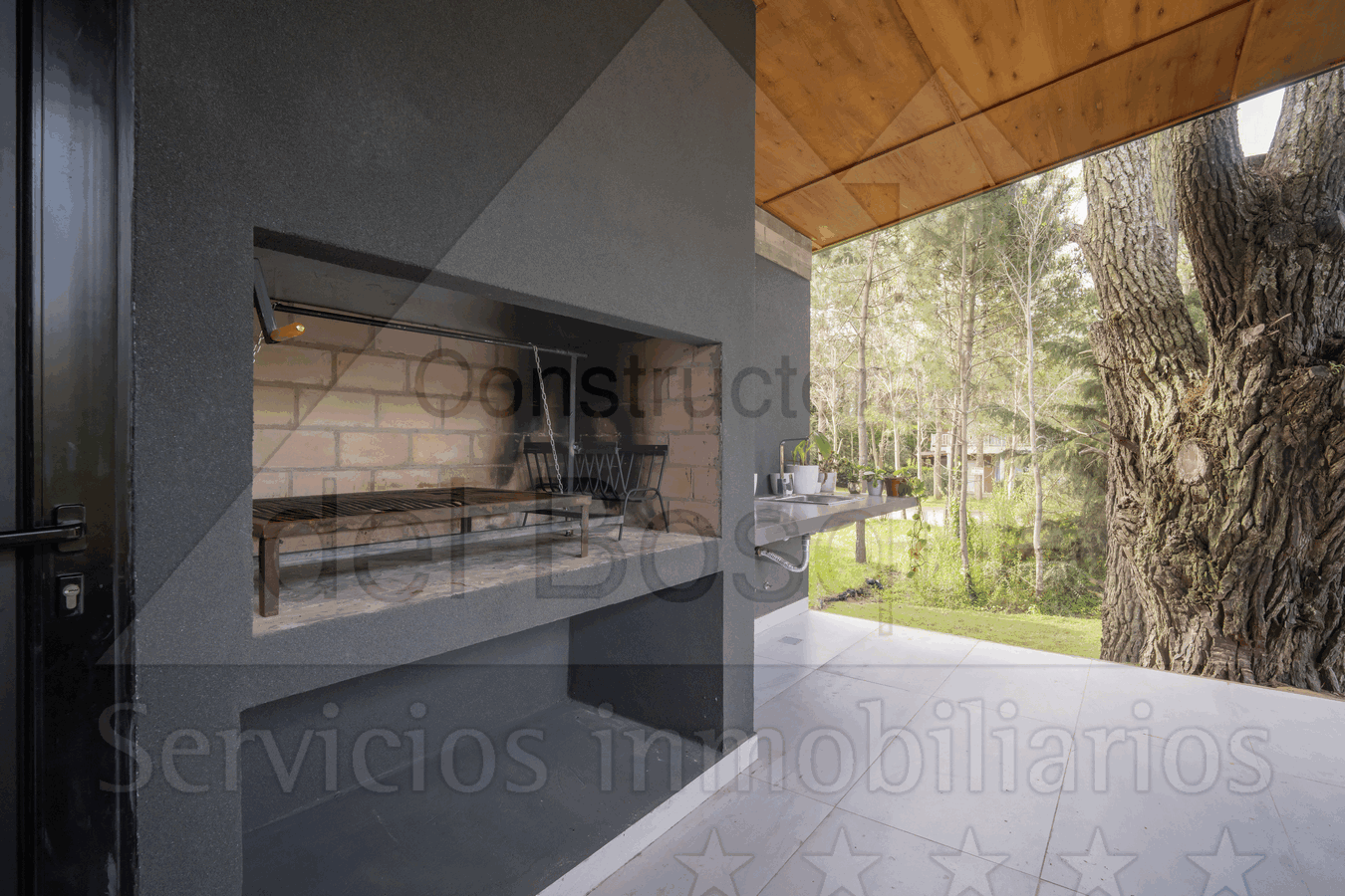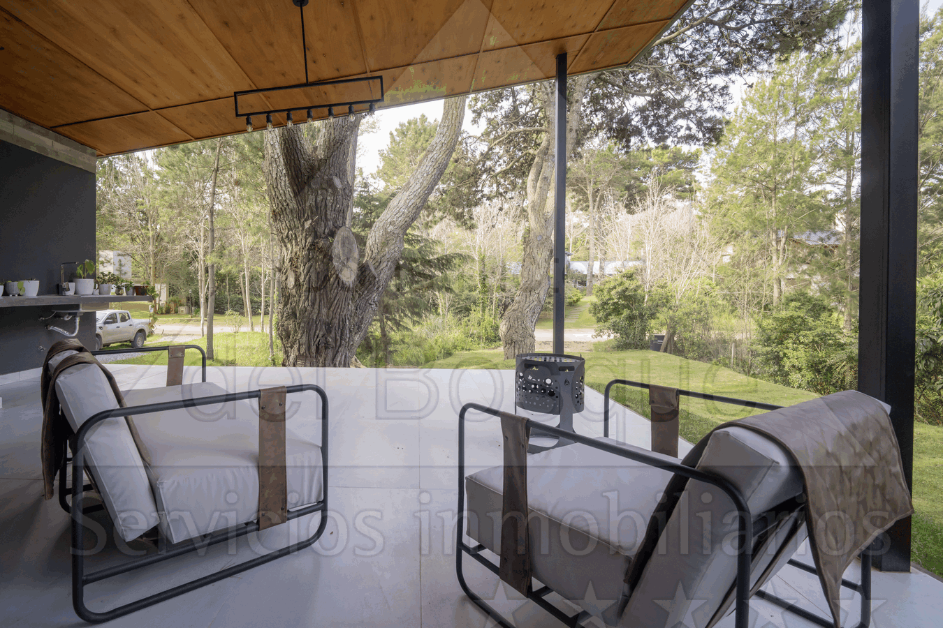 Acceso por escaleras donde encontramos un hermoso espacio de living totalmente vidriado, comedor integrado y la cocina totalmente equipada con una amplia barra desayunadora y conexión al sector exterior donde encontramos el living exterior con su mobiliario y la parrilla techada con vista al jardín .