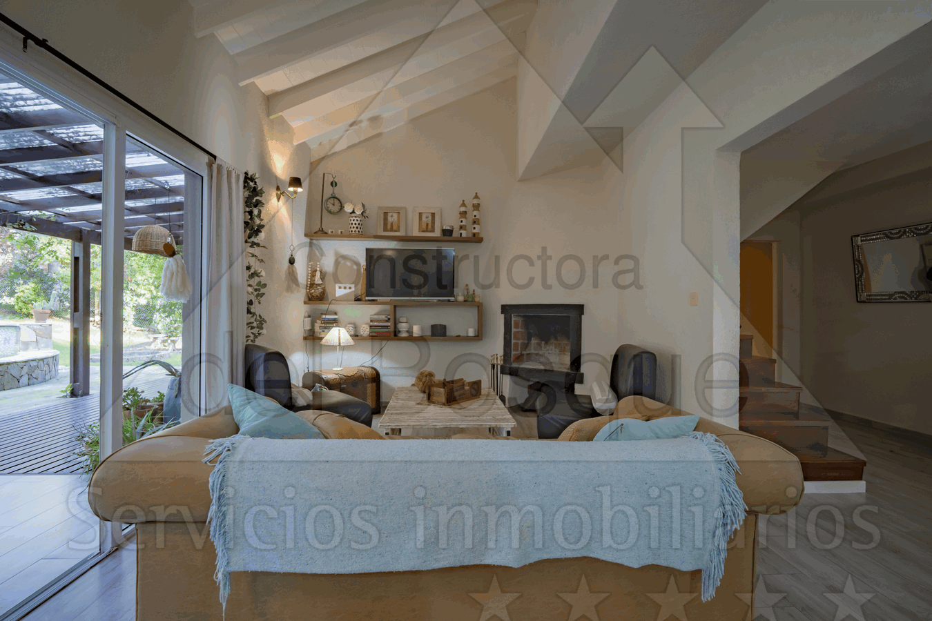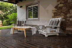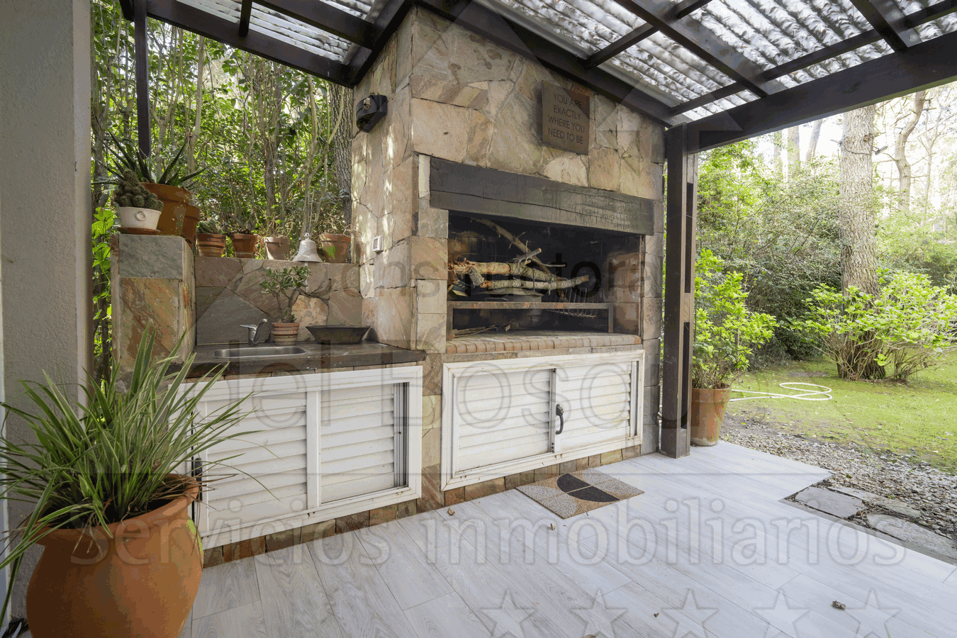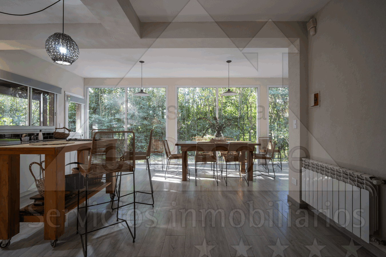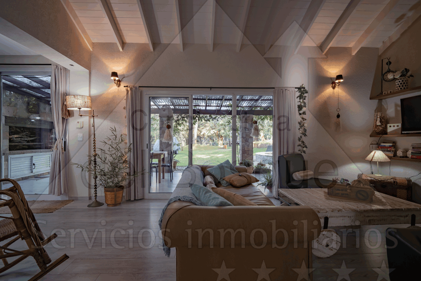 Acceso a la casa por el lateral donde encontramos un amplio living con hogar a leña, comedor integrado con salida a la galeria de frente, parque amplio con una mini pileta calefaccionada, fogonero y parrilla techada.